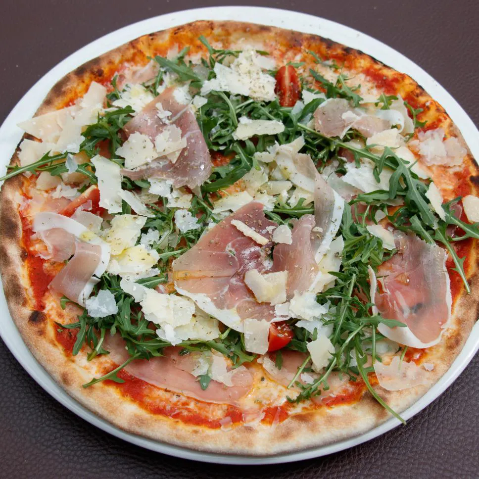 Tomatensauce, Mozzarella, Prosciutto, Rucola, Parmesan