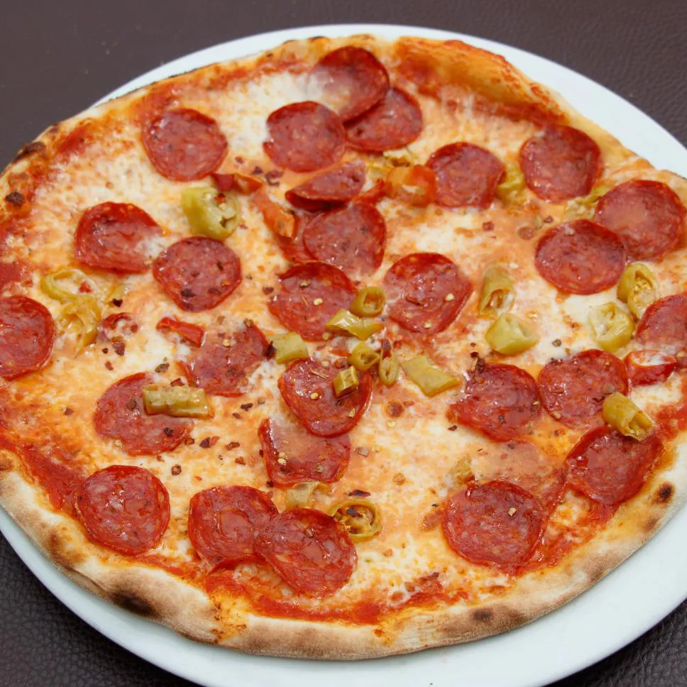 Tomatensauce, Mozzarella, pikante Salami, Pfefferoni, Chiliflocken