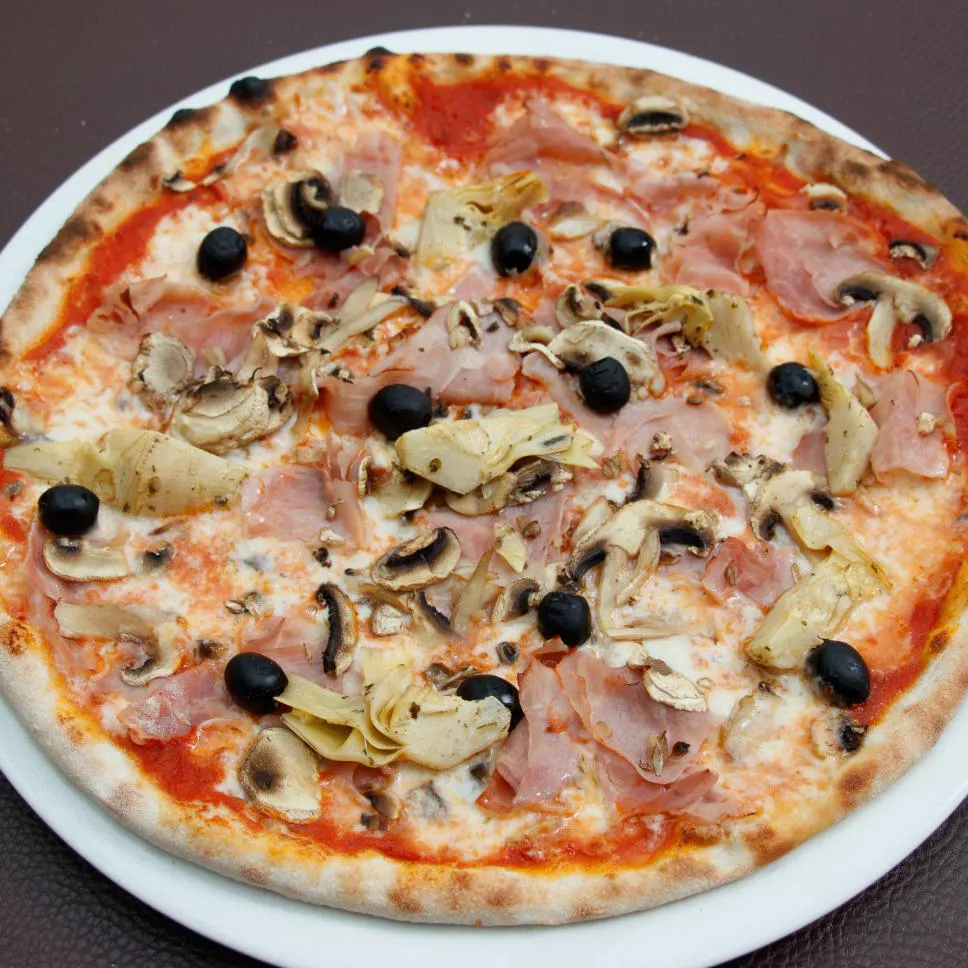 Tomatensauce, Mozzarella, Schinken, Champignons, Artischocken, Oliven